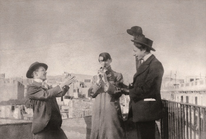 Pablo Picasso. Picasso, Àngel Fernández de Soto i Sebastià Junyer i Vidal al cafè. Barcelona, c. 1903. Tinta sèpia a ploma sobre paper 13,2 x 9 cm. Donació Sebastià Junyer i Vidal, 1966. Museu Picasso, Barcelona. Fotografia: Estudi Gasull. MPB 70.808 | Picasso, Ángel Fernández de Soto i Carles Casagemas a la terrassa familiar del primer, en el carrer de la Mercè c. 1900. Font: Arxiu Eduard Vallès, Barcelona