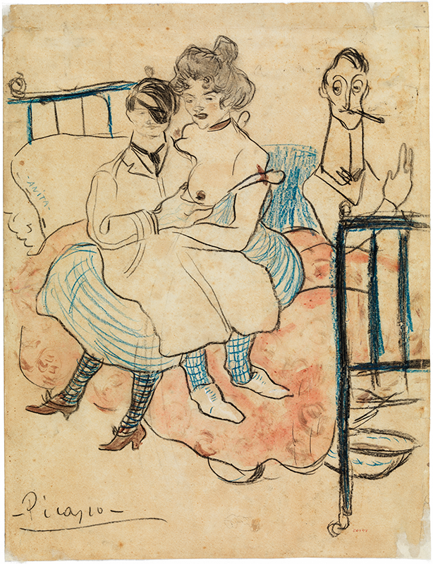 Pablo Picasso. Els germans Mateu i Àngel Fernández de Soto, amb Anita. Barcelona, 1902-1903. Llapis Conté, llapis de color blau i sèpia i aquarel·la sobre paper. 31 x 23,7 cm (irregular). Aportació de l'Ajuntament de Barcelona, 1963. Museu Picasso, Barcelona. Fotografia: Estudi Gasull. MPB 50.498 | Pablo Picasso. Àngel Fernández de Soto amb una dona. Barcelona, 1902-1903. Tinta sèpia a ploma, aiguada, aquarel·la i llapis Conté sobre paper. 21 x 15,2 cm. Aportació de l'Ajuntament de Barcelona, 1963. Museu Picasso, Barcelona. Fotografia: Estudi Gasull. MPB 50.494