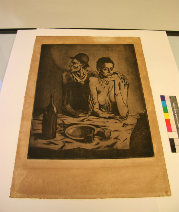 Pablo Picasso. L'àpat frugal. París, setembre del 1904. Aiguafort i raspat sobre planxa de zinc estampat sobre paper. 46,3 x 37,7 cm (planxa). 61,4 x 44,3 cm (irregular; làmina). Donació Pablo Picasso, 1970. MPB 110.011