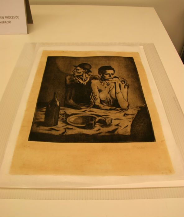 En el cas de L'àpat frugal de la col·lecció del Museu Picasso, la petjada del temps era notòria i mostrava un greu enfosquiment que alterava la correcta percepció de la imatge.