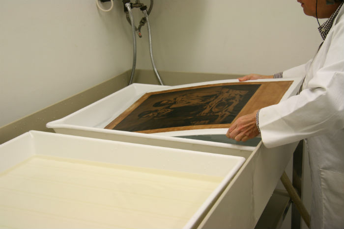 Per al tractament de taques i aureoles s’han fet processos locals aplicant aigua desionitzada, però per a la majoria hem hagut d’aprofundir en la neteja de les fibres, per alliberar el paper dels àcids més superficials i facilitar la recuperació de la humitat interna del paper perduda amb el pas del temps. Finalitzada aquesta fase de neteja humida es va procedir a la desacidificació incorporant al paper una reserva alcalina que el neutralitza i el protegeix d’una nova acidificació.