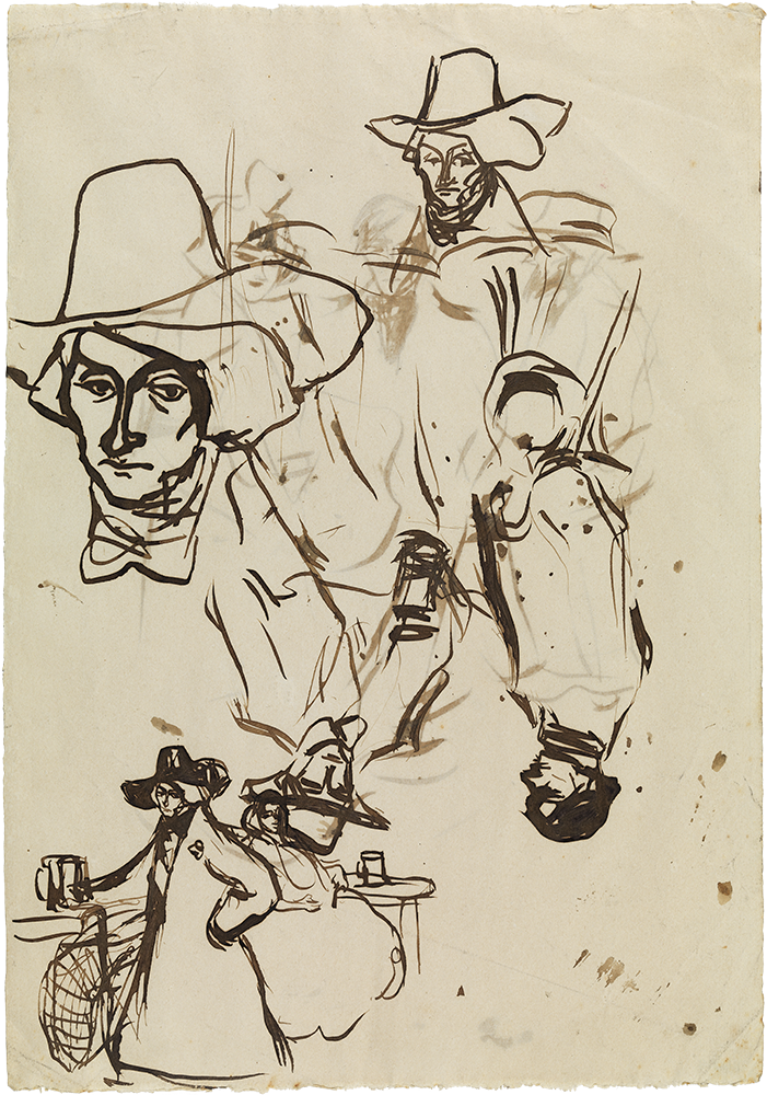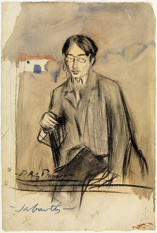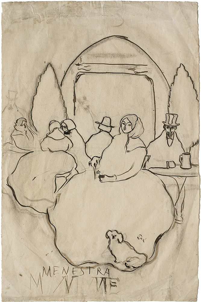 Pablo Picasso. Esbós per a ¡Pobres genios! Barcelona, 1899-1900. Tinta sèpia a ploma sobre paper. 13,3 x 20,7 cm. Donació Pablo Picasso, 1970. MPB 110.714 | Pablo Picasso. Retrat de Jaume Sabartés, assegut. Barcelona, 1900. Carbonet i pintura a l'essència sobre paper. 48,5 x 32,4 cm. Donació Jaume Sabartés, 1962. MPB 70.228 | Pablo Picasso. Retrat d'Eveli Torent i Marsans. Barcelona, 1899-1900. Carbonet sobre paper. 47,5 x 31,4 cm. Donació Pablo Picasso, 1970. MPB 110.855