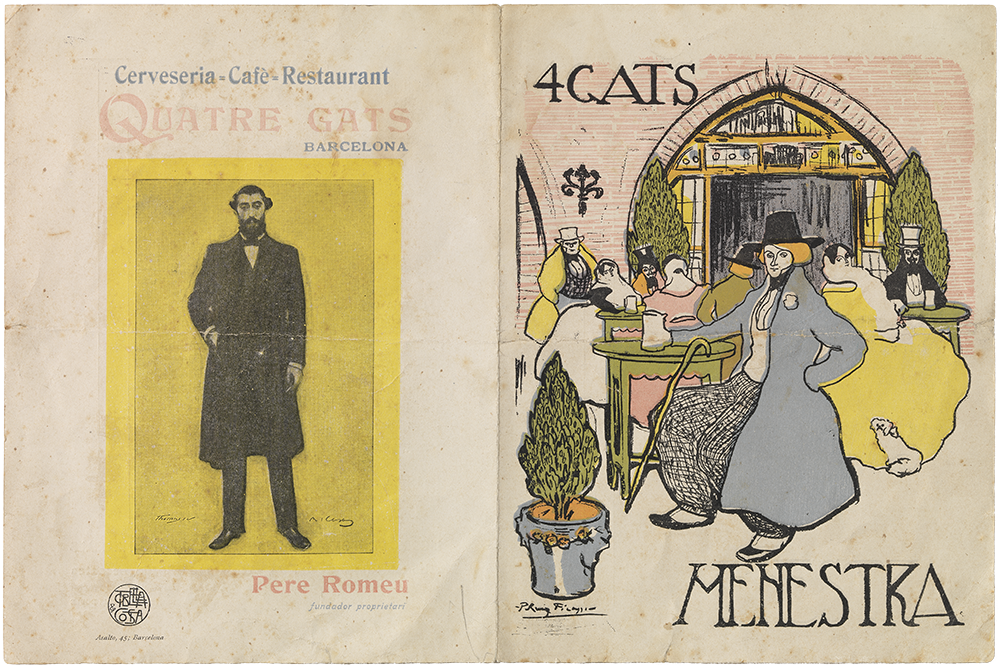 Pablo Picasso. Imprès del menú de Quatre Gats. Barcelona, 1899-1900. Paper imprès (cromolitografia). 21,8 x 32,8 cm. Donació Pablo Picasso, 1970. MPB 110.995 | Pablo Picasso. Estudi per al menú de Quatre Gats. Barcelona, 1899-1900. Tinta sèpia a ploma i carbonet sobre paper. 46,7 x 30,7 cm. Donació Pablo Picasso, 1970. MPB 110.802 | Pablo Picasso. Apunts per al menú de Quatre Gats. Barcelona, 1899-1900. Tinta sèpia a ploma sobre paper. 32,2 x 22,5 cm. Donació Pablo Picasso, 1970. MPB 110.818