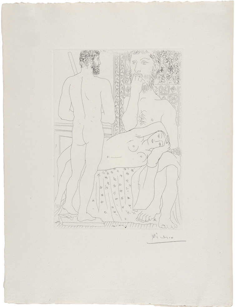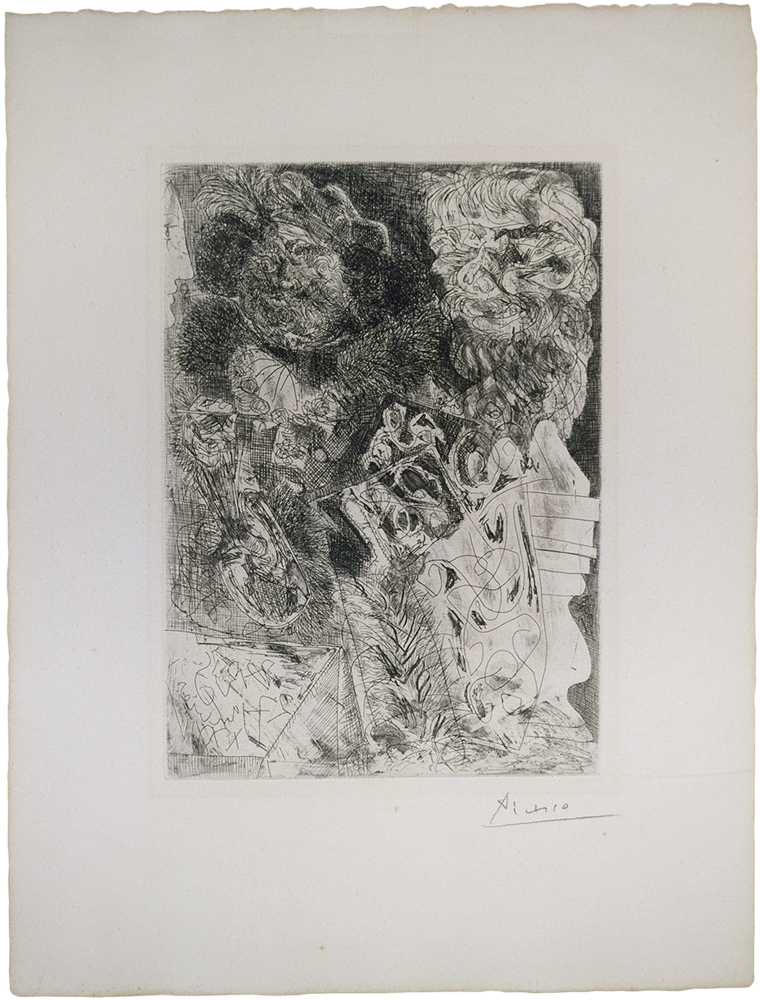 Pablo Picasso. Escultor, model ajaguda i autoretrat com a Hèrcules esculpit. París, 17 de març del 1933 (II). Aiguafort sobre coure estampat sobre paper. 26,8 x 19,5 cm (planxa); 44,5 x 34 cm (làmina). Adquisició, 1986. MPB 112.841 | Pablo Picasso. Rembrandt amb el seu “Turbant”, les seves “Pells” i l’”Ull d’elefant”. París, 27 de gener del 1934 (IV). Aiguafort sobre coure estampat sobre paper. 27,8 x 19,9 cm (planxa); 44,8 x 34 cm (làmina). Adquisició, 1989. MPB 112.923