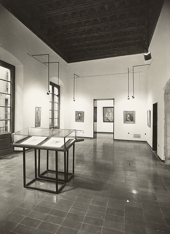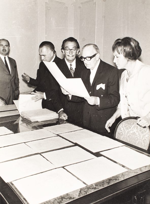 Obres aportades pel l’Ajuntament de Barcelona, situades a les sales del Palau Berenguer d’Aguilar. Fotògraf desconegut | Salvador Dalí fent donació dels gravats de Picasso que van il·lustrar l’edició francesa del llibre Les Metamorphoses d’Ovidi. Fotògraf: Pérez de Rozas