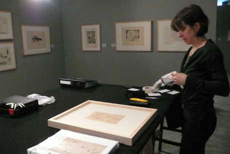 Examinant l'estat de conservació del dibuix Croquis taurins (Barcelona 1900, MPB 110.412). Penjats a la paret alguns gravats dels anys 1930-1945.