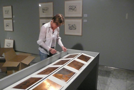 Dreta: La comissària de l'exposició supervisa les cartel·les de la vitrina amb les matrius de les aiguatintes del llibre Tauromàquia o l'art de torejar. És la primera ocasió en què s'exposen fora del Museu Picasso les estampes i les matrius a la vegada.