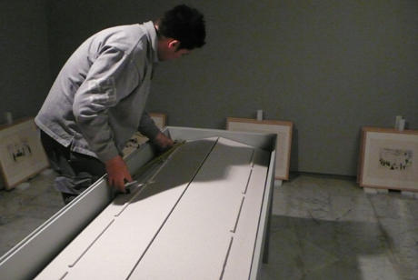 Dreta: Preparant la vitrina per a les matrius de les aiguatintes de la Tauromaquia o l'art de torejar. La fragilitat de les planxes ha obligat a construir unes vitrines que garanteixin l'estabilitat de la humitat i la temperatura i que les matrius reposin sobre un material neutre.