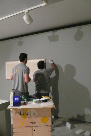 Esquerra: Posant les cartel·les de les obres a la Casa Lis. S'ha posat una atenció especial als textos explicatius i a les cartel·les per proporcionar la informació necessària, al mateix temps que concisa.