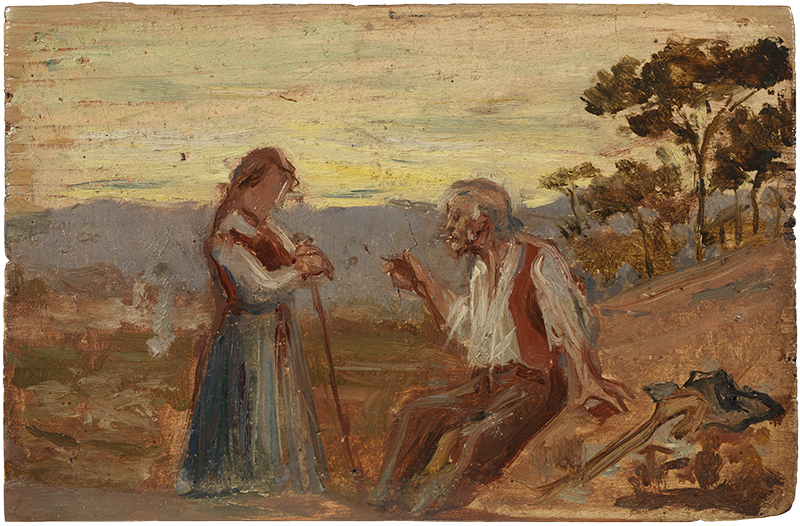 Pagesos al camp. Pablo Picasso. Màlaga, juny-juliol 1896. Oli sobre fusta. 10 x 15,5 cm. MPB 110.139 | Arbreda. Pablo Picasso. Barcelona, 1896. Oli sobre fusta. 10 x 15,6 cm. MPB 110.181| Platja de la Barceloneta. Pablo Picasso. Barcelona, 1896. Oli sobre tela. 24,4 x 34 cm. MPB 110.073
