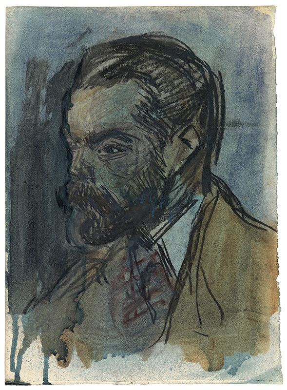 Sebastianus III König. Pablo Picasso. Barcelona, 1899-1900. Llapis grafit, llapis blau i aquarel·la sobre paper envernissat posteriorment. 21 x 16 cm. MPB 70.809 | Retrat de Joaquim Mir. Pablo Picasso. Barcelona, 1899-1900. Llapis Conté i aquarel·la blava pulveritzada sobre paper. 20,8 x 15,5 cm. MPB 110.403 | "Poeta decadente". Retrat de Jaume Sabartés. Pablo Picasso. Barcelona, 1900. Carbonet i aquarel·la sobre paper. 48 x 32 cm. MPB 70.232