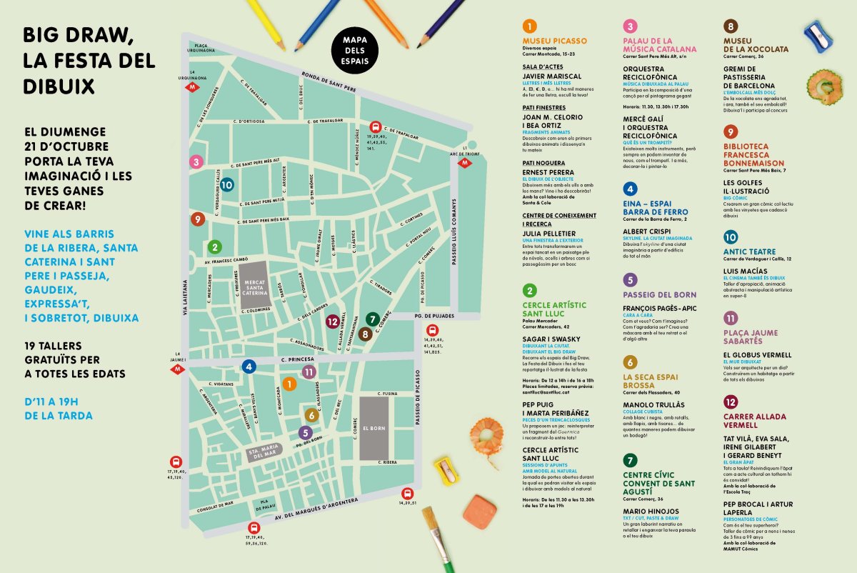 Altres semblances amb les anteriors edicions és que el projecte manté una mida similar i el número de tallers no varia gaire: són 19 tallers en total, repartits pels barris de La Ribera, Santa Caterina i Sant Pere, tots ells gratuïts i pensats per a totes les edats. Donem la benvinguda a l’Antic Teatre, que hi participa per primer cop, i celebrem la implicació, un any més, del Palau de la Música, el Cercle Artístic Sant Lluc (que funciona com a segona seu del Big Draw, amb un dels dos punts d’informació), la Biblioteca Francesca Bonnemaison, l'Escola Eina, La Seca Espai Brossa, el Centre Cívic Convent de Sant Agustí i el Museu de la Xocolata.