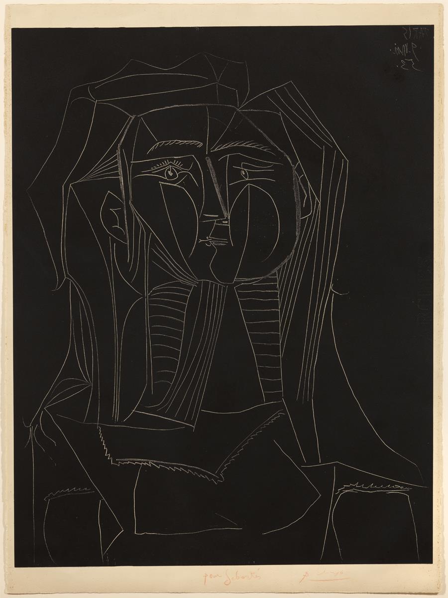 Litografia. Raspador sobre zinc lleugerament granejat; estampat en negatiu sobre paper vitel·la Arches (prova Sabartés). Composició destinada a ser gravada a l'aiguafort, però degut a que la planxa no permet el tiratge mitjançant aquest procediment, Picasso decideix estampar-la en negatiu amb la premsa litogràfica, aconseguint molt bon resultat