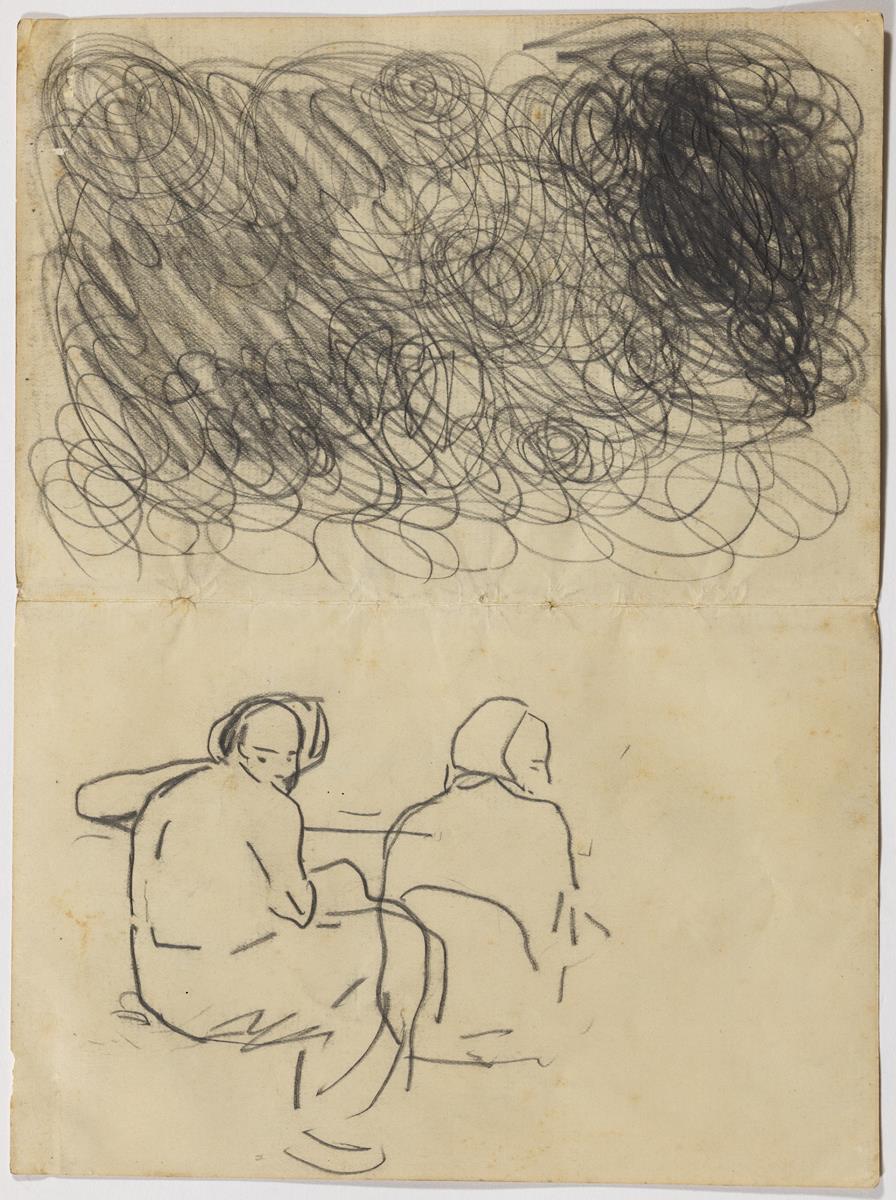 Dos personatges, asseguts d'esquena, i traços