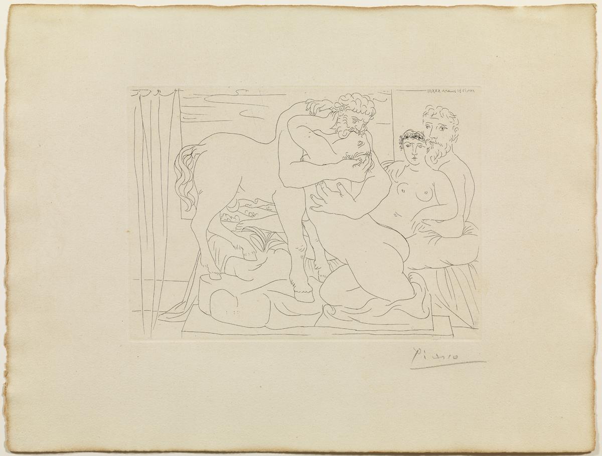 Escultor i la seva model amb un conjunt escultòric representant un centaure abraçant una dona