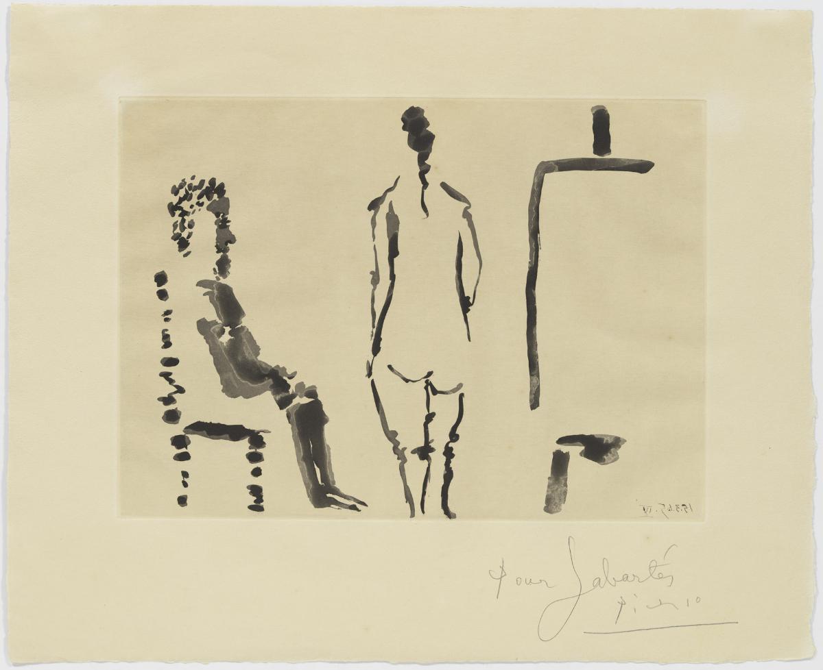 Aiguatinta (mossegada directa amb pinzell en el granejat) i punta seca (data) sobre coure; estampat sobre paper vitel·la Richard de Bas (prova Sabartés)
