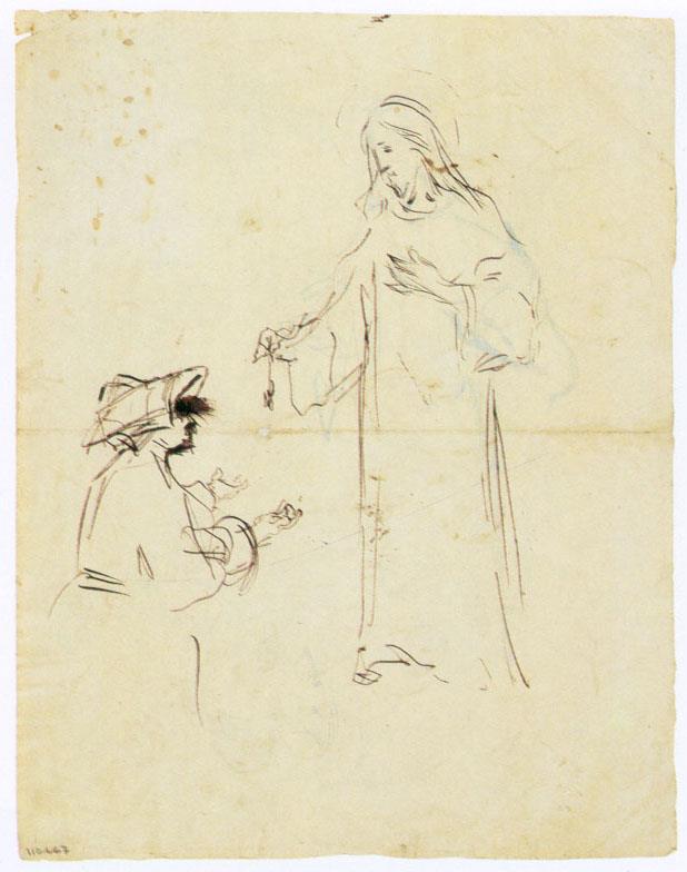 Tinta a ploma i pinzellades de tinta blava sobre paper verjurat