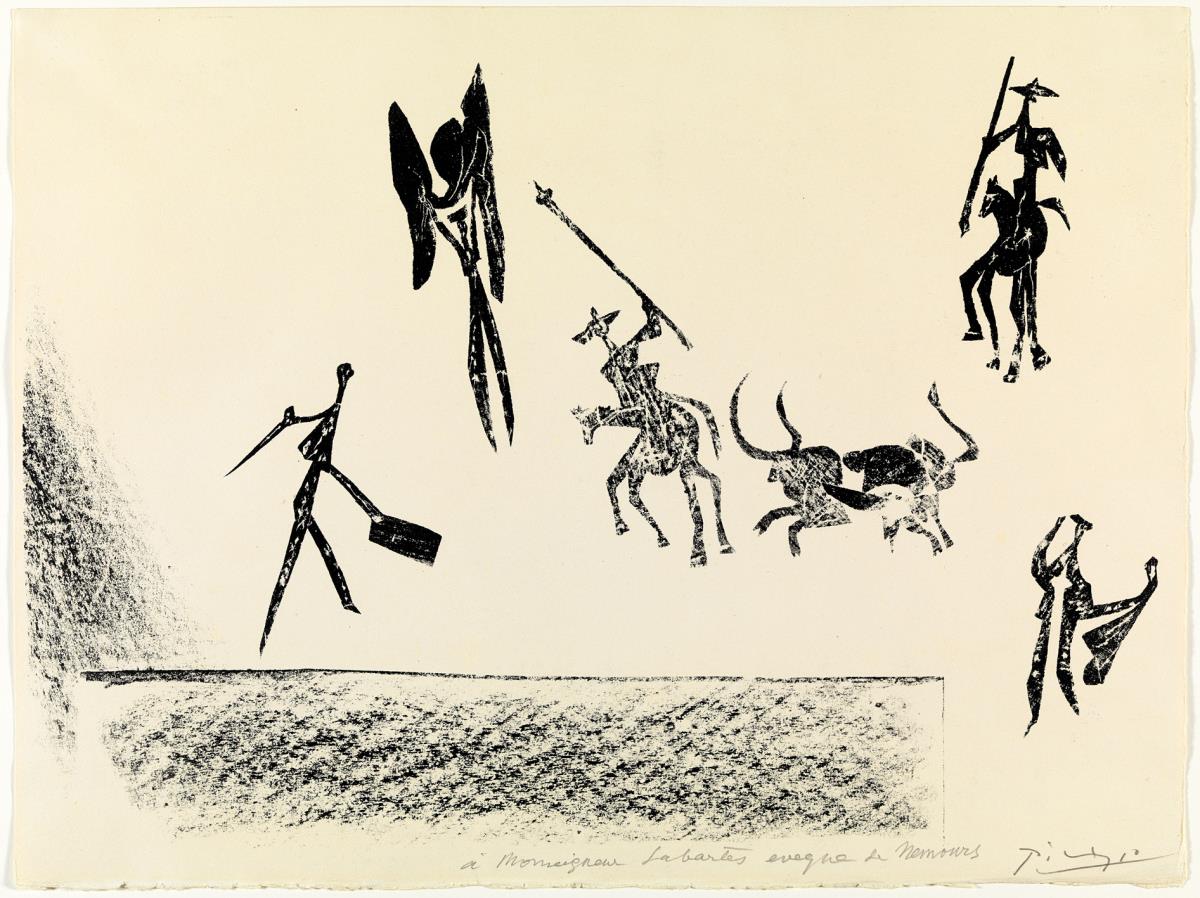 Lithograph. Lithographic ink, lithographic crayon, frottage and scraper on transfer paper, cut-out and pasted, and transferred to stone; printed on Arches vellum paper (Sabartés proof)