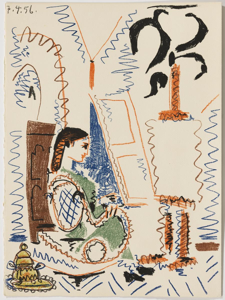Lithograph in six colours. Lithographic crayon on transparent transfer paper transferred to stone; printed on Arches vellum paper (Sabartés proof, I state)