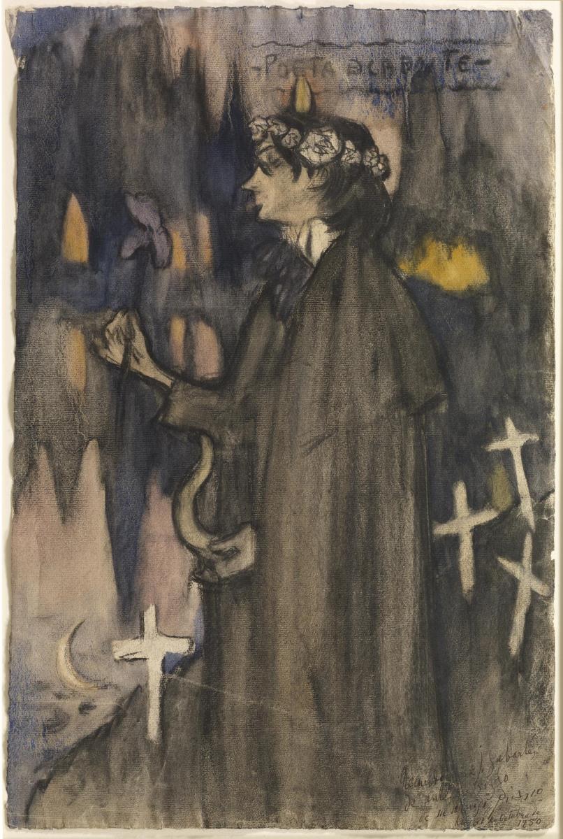 This portrait, in which Picasso ridiculed his friend’s literary ambitions, seems to have been inspired by Santiago Rusiñol’s Hojas de la vida (1898), to be precise by the story entitled «Deseo» and the illustrations accompanying it, made by Ramon Pichot. In this text, characteristic of the aesthetics of decadentism, Rusiñol –a key artist for the young Picasso– praises the lakes inside caves, ideal cemeteries for men, peaceful places of sublime natural beauty. Picasso remained more faithful to the literary text than to the illustrations by Pichot (who would become a close friend of his), and reproduced the setting created by the cemetery and the lake. Sabartés was disguised as a «decadent poet», as evoked by the title of the drawing, his character emphasised by the lily in his hand, the cape and crown of flowers. As Sabartés himself would recall many years later, «Picasso hands me a paintbrush and asks me to sit for him: hold it in your fingers, as if it were a flower…» (Picasso. Retratos y recuerdos, 1953).