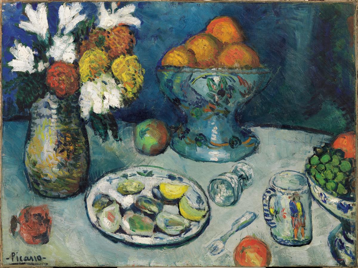 The bright colours and thick vibrant brushstrokes that characterised the works Picasso hung at Vollard’s in June 1901 are repeated here, although this canvas also conveys his first reflections on the still lifes painted by Cézanne, whose works he had had occasion to behold at the ‘Centennale’ section of the Parisian Exposition Universelle of 1900 and during his visits to Vollard’s gallery. In order to highlight the volume and material substance of the objects depicted, Picasso used contrasting textures, shaping the jug, vase and fruit bowls with vibrant impastos and turning to subtle nuances of colour for the glass and the dish of oysters. By duplicating the angle of vision of the fruit bowl and the table surface he managed to achieve a sense of depth without a vanishing point. The thick outline of the objects recalls those in works by Gauguin and Van Gogh that Picasso had also had the chance to admire on his first visit to Paris.