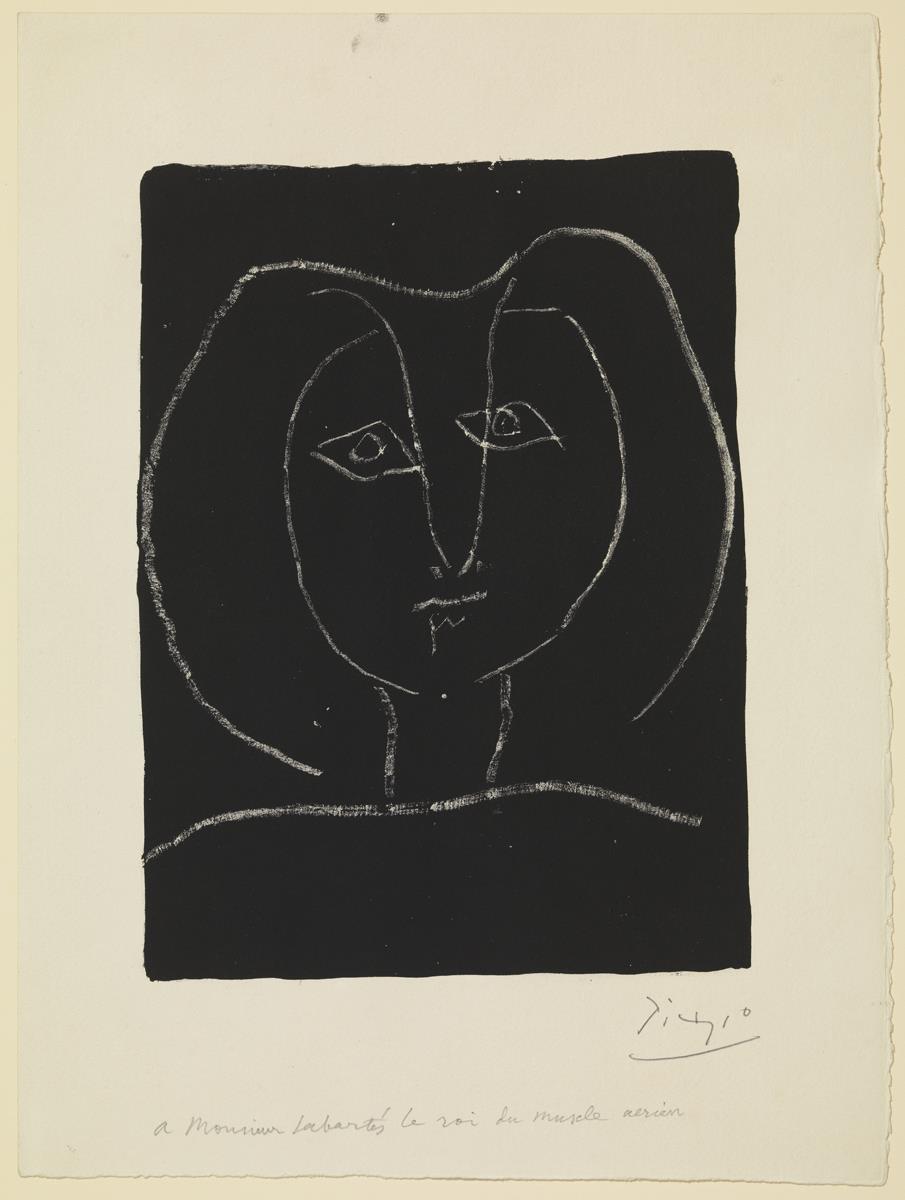 Lithograph. Lithographic ink, scraper and knife on transfer paper transferred to stone; printed on Arches vellum paper (Sabartés proof)