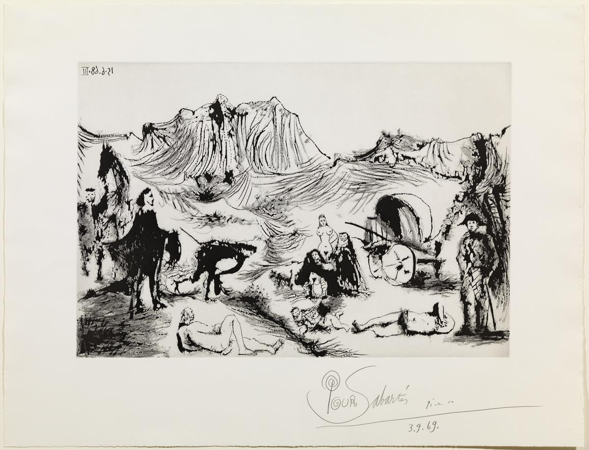 Sugar-lift aquatint on greased copper; printed on Rives vellum paper (Sabartés proof)