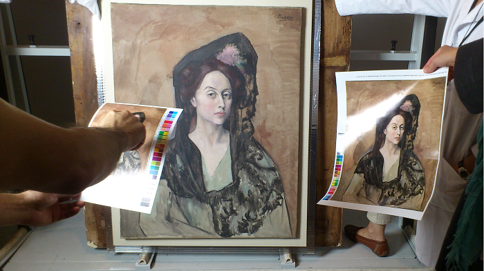 Therefore, what is done to try to get the reproduction closer to the reality? The technicians in photo-mechanics prepare what we call the “colour test”, that is to say, the printing of the image by means of a calibrated printer according to the ISO regulation 12647-2 (Fogra 39L). This test, even though it has a “glossy” aspect that doesn’t correspond with that of the paper to be used in the printing, allows us to have an idea of what the final image will be like. This test is compared with the original work that we conserve in the museum and in this way we can see which corrections need to be made on the original digital file which will be included in the layout design. We do as many corrections as necessary until we finally get a definitive proof (and therefore a file) that we consider to be the good one. But what happens when the work to be reproduced isn’t in our museum? How can we be sure that the proof that we produce is similar to the original? In these cases, we ask the owner to send us a proof that he or she considers to be good or we send ours so that it can be validated. Sometimes, the indications ?”a bit darker”, “too black”...? are not easy to turn into corrections if we continue not being able to see a correct image of the work.