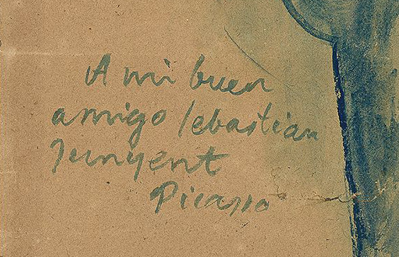 Signature: A mi buen amigo Sebastian Junyent. Picasso (To my good friend Sebastian Junyent. Picasso)