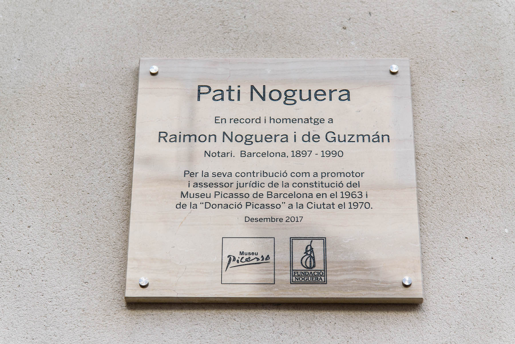 Plaque of homage to Raimon Noguera i de Guzmán, located in the Pati Noguera of the Museu Picasso since December 2017.