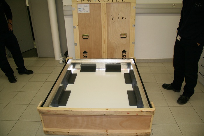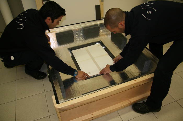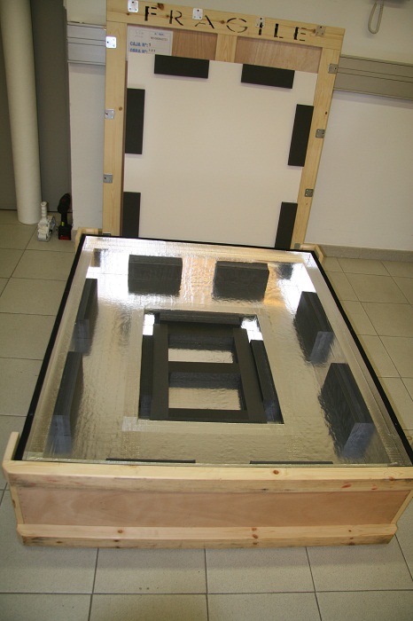 In this case, as three works were to be shipped (an oil painting of 100x80 cm and two small copper plates of some 20x30 cm) a wooden packing case was made to size adapted internally to locate the two plates in a specific compartment. This compartment is made of a specific material which prevents the corrosion of the metals.