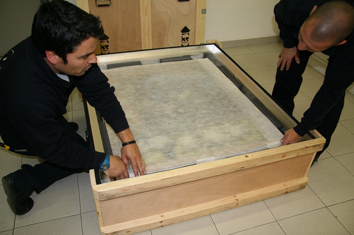 First of all, the two copper plates are packed and then the oil painting is prepared wrapping it in paper so as to avoid any penetration of dampness, but at the same time allowing the work to breathe. Once wrapped, it is carefully placed in the wooden packing case and it is closed and secured.