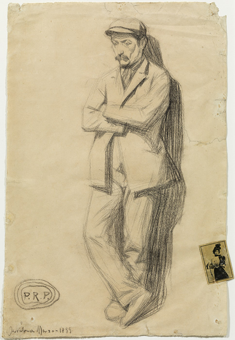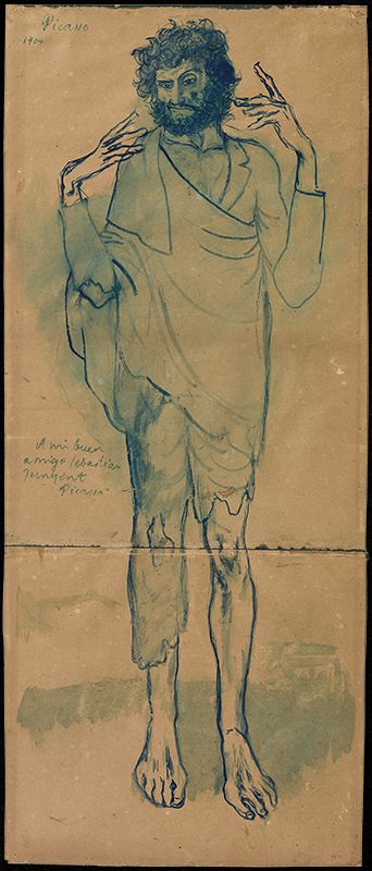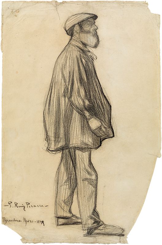Pablo Picasso. Man leaning against a wall. Barcelona, march 1899. Conté crayon on paper and illustration attached to the right side. 49 x 32.7 cm. Gift of Pablo Picasso, 1970. Museu Picasso, Barcelona. MPB 110.844 | Pablo Picasso.Home amb barba, dempeus i de perfil. Barcelona, march 1899. Conté crayon on paper. 48.5 x 32 cm. Gift of Pablo Picasso, 1970. Museu Picasso, Barcelona. MPB 110.848