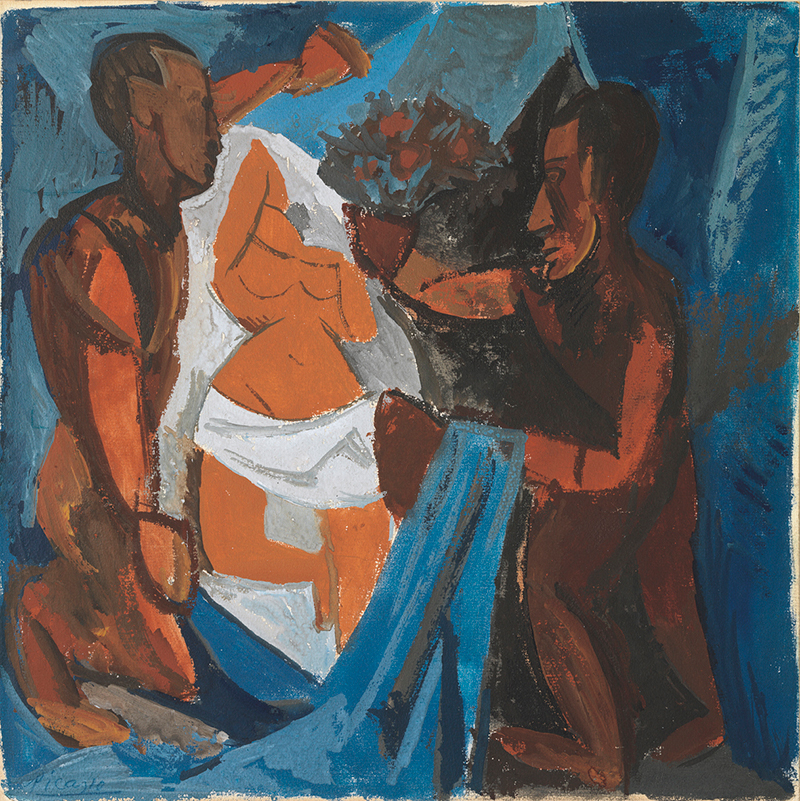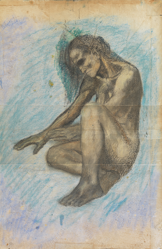 Pablo Picasso. The madman. 1904. Watercolour on paper. 85 x 35 cm.Given by the Barcelona City Council, 1963. Museu Picasso, Barcelona. MPB 4.272 | Pablo Picasso. The Offering. Paris, 1908. Gouache on cardboard with white primer. 30.6 x 30.6 cm. Gift of Lord Amulree, 1985. Museu Picasso, Barcelona. MPB 112.761 | Pablo Picasso.Old woman, seated. June, 1903. Pastel and charcoal on cardboard (folder cover). 60 x 40 cm.Given by the Barcelona City Council, 1963. Museu Picasso, Barcelona. MPB 110.015