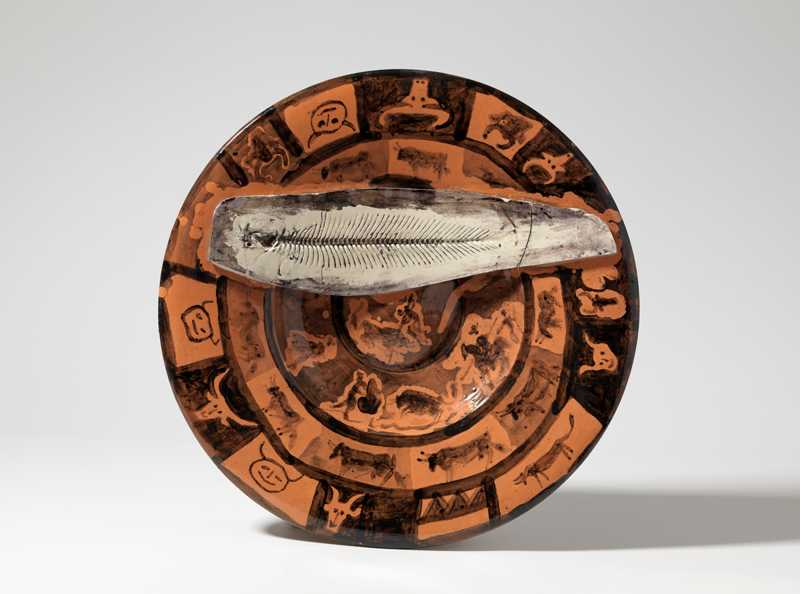 Picasso, Pablo, Cursa de braus i peix (revers: Cares). Ceràmica (obra visual). Lloc d'execució Canes, [16/04/]1957. Donació, Jacqueline Picasso, 4-6-198. MPB112446