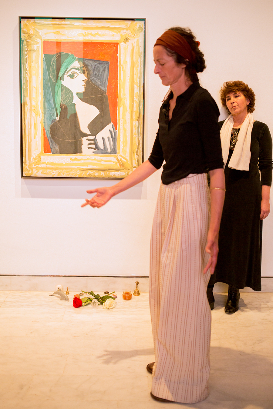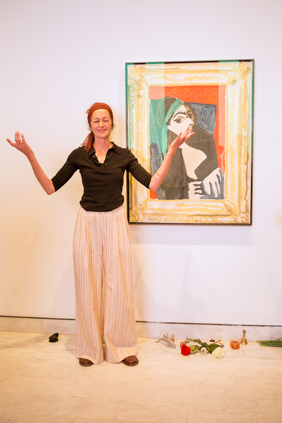 Eulàlia Valldosera, during 'The other invisibles' action, in front of the portrait of Jacqueline by Pablo Picasso, 1957