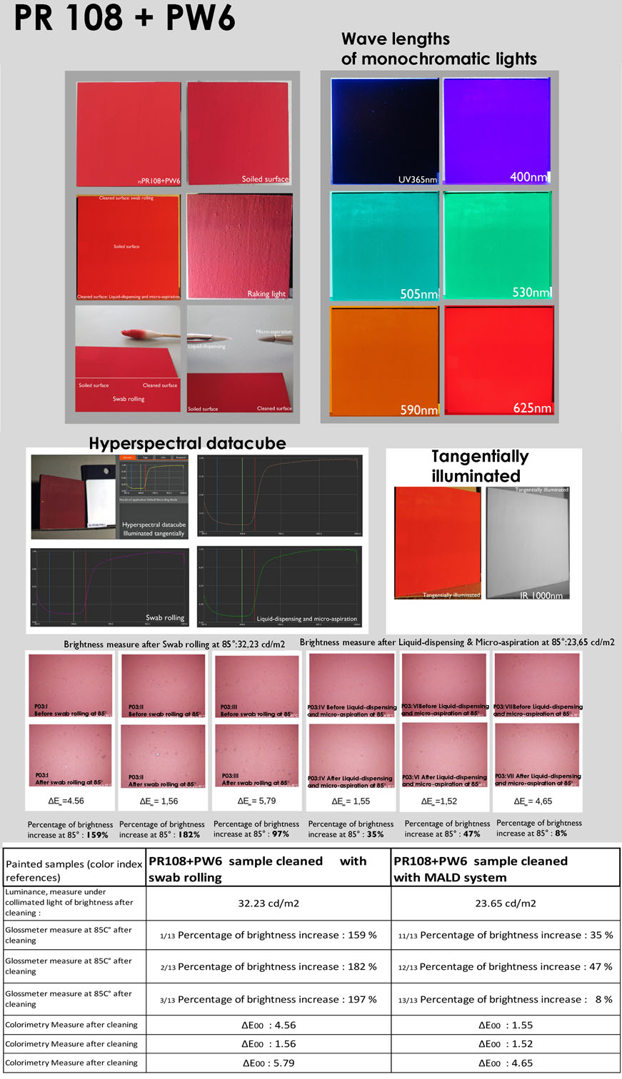 Figure 14 shows the comparative action of cotton swabs vs. MALD system in sample PR108+PW6 where both the physical abrasion and the gloss change due to rubbing with the cotton swab can be observed.