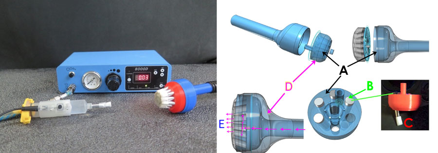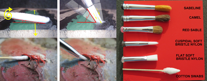 Fig. 8 (a,b) Comparative action of cotton swabs and different brush dispensing-tips.