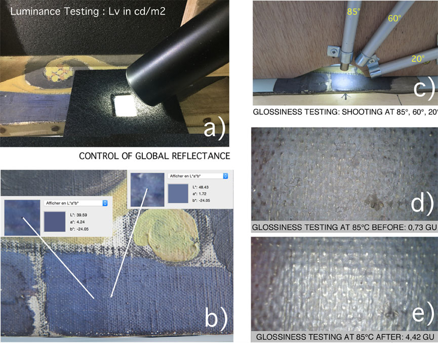 Fig.15 (a-e) Optical study of the test painting: a) Luminance testing; b) Study of global reflectance; c) Glossiness Testing (shooting at 85º, 60º and 20º); d) Glossiness Testing at 85º before the swab rolling action; e) Glossiness Testing at 85º after the swab rolling action.
