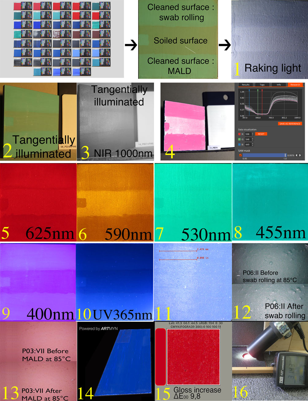 1. Raking light; 2. Tangent light reflection; 3. Infra-red tangent light at 1000nm; 4. Hyperspectral imaging with tangent illumination (204 spectrums); 5. Incident Monochromatic light at 625nm ; 6. Incident Monochromatic light at 590nm ; 7. Incident Monochromatic light at 530nm ; 8. Incident Monochromatic light at 455nm ; 9. Incident Monochromatic light at 400nm ; 10. UV light at 365nm; 11. Visible light x50 and x250 12. Gloss observation at 20°, 60° and 85° before and after swab rolling cleaning; 13. Micro-photographies taken under retro-diffused lighting at 20°, 60°, 85° before and after cleaning with MALD system; 14. 3D scan; 15. Colour and gloss measurement; 16. Luminance measurement.