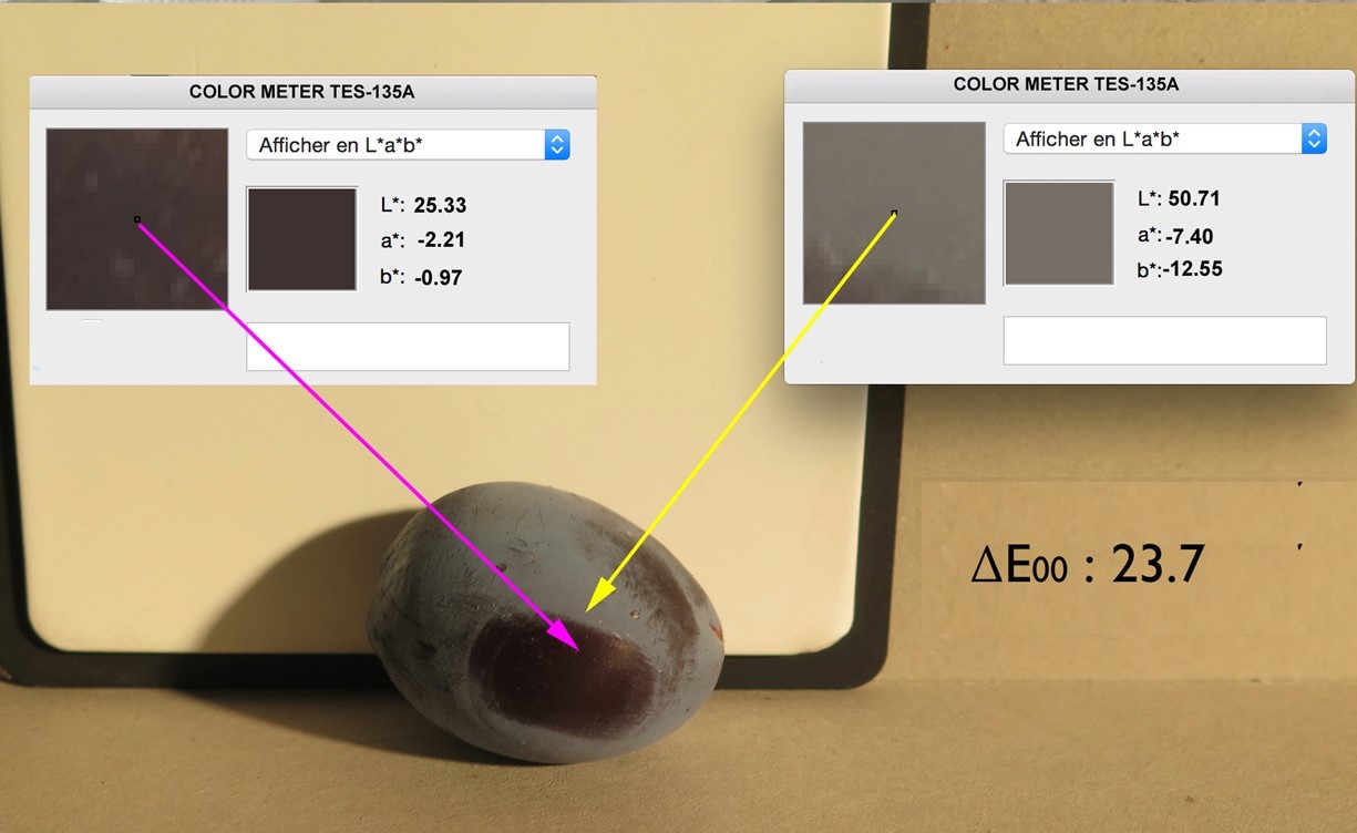 Fig. 5. Colour difference in different spot measurements taken on the skin of a prune due to the bloom.