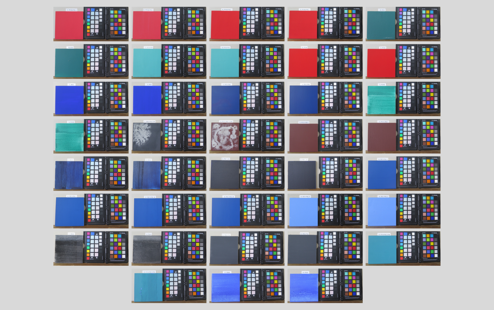 For this purpose, each sample was documented under 16 different examination conditions including colour and gloss measurements as well as hyperspectral and 3D imaging in order to document changes in the superficial texture of the different painted surfaces tested. The measurements were always taken before samples had been soiled and after having been cleaning with both the cotton swab and MALD system. Considering the magnitude of this study, in this paper only the results corresponding to the representative samples ref. PB27+PW6, PG18 and PR108+PW6 are shown.