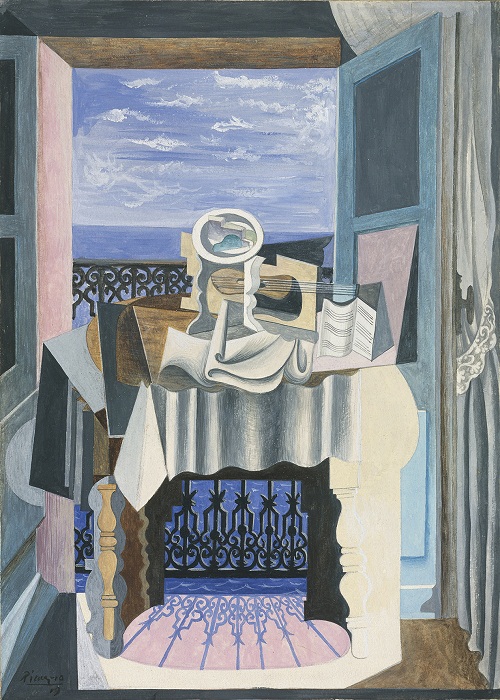 Pablo Picasso. Still Life in front of a Window, Saint-Raphaël. 1919. Gouache and graphite on paper. 30,5 x 22,5 cm. Staatlichen Museen zu Berlin. Nationalgalerie, Museum Berggruen bpk / Nationalgalerie, SMB, Museum Berggruen / Jens Ziehe. Succession Pablo Picasso, VEGAP, Madrid 2015 | Salvador Dalí. Table in font of the Sea. Homage to Erik Satie. 1926. Oil on canvas. 49,5 x 90cm. Fundació Gala-Salvador Dalí, Figueres. Nl 0022. Fundació Gala-Salvador Dalí, Figueres 2015