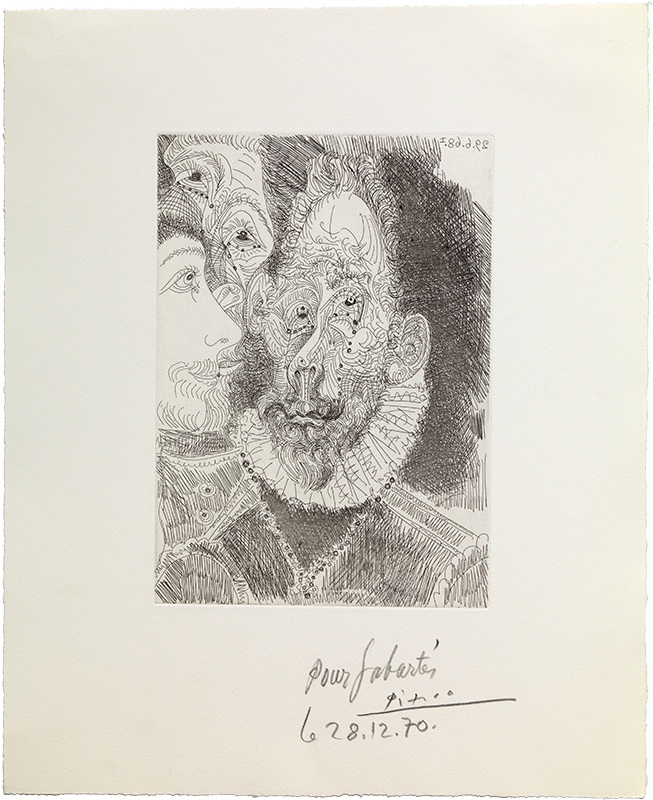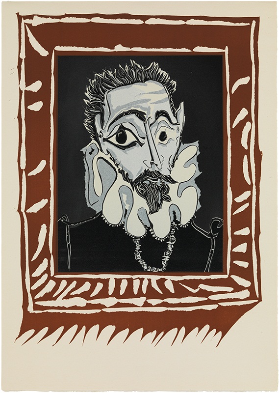 Pablo Picasso. Portrait of a man in a ruff. Variation after El Greco. Mougins, , 9th April, 1962. Etched with a gouge in five colours on two linoleum plates, printed on Arches vellum paper (Sabartés proof, IV and final state). 34.8 x 27 cm (plate); 62.5 x 44.5 cm (paper). Acquisition, 2007. Museu Picasso, Barcelona. Photo: Estudi Gasull. MPB 113.128 | Pablo Picasso. Portrait-caricature of one of the characters in "The Burial of the Count of Orgaz" in tears. Mougins, 29th June, 1968 (I). AEtching on copper plate, printed on Rives vellum paper (Sabartés proof). 20.8 x 15 cm (plate); 34.6 x 28.5 cm (paper). Gift of Pablo Picasso, 1971. Museu Picasso, Barcelona. Photo: Estudi Gasull. MPB 111.967