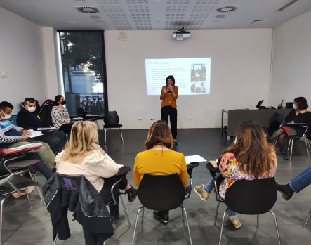 Durante este primer curso del proyecto se ha trabajado en formaciones con las maestras y profesoras de las citadas entidades educativas. La primera, impartida por GrefArt, tuvo lugar en setiembre de 2021 y giró en torno a las estrategias para profundizar en aspectos emocionales dentro del aula, en tutorías, asambleas, así como en otros espacios. En noviembre de 2021, el equipo del Museu impartió la segunda formación centrada en dar a conocer la metodología de VTS, como herramienta transversal y como una manera de acercarse al arte desde el interés propio, ayudando de esta manera al alumnado a desarrollar capacidades de observación, capacidades lingüísticas y de pensamiento crítico. La coordinadora del proyecto, Aida López, que es docente de lengua inglesa en el Instituto La Guineueta de Barcelona, conocía el uso que se hacía en el Museu de esta metodología VTS y valoró, al definir el proyecto, que sería una herramienta complementaría de importancia en el trabajo de las cuatro instituciones educativas. Por esa razón, se puso en contacto con nosotras y pasamos a formar parte de nuestro primer proyecto europeo. La formación se ha dirigido a 15 docentes y llegará, de manera directa o indirecta, a los más de 2500 alumnos del Instituto Yomra Merkez Ortaokulu de Turquia, el Institut Comprensivo Statale Giovanni Paolo II de Italia y el Instituto Liceul Tehnologic Elie Radu de Romania. En el Departamento Educativo, Maria Alcover, Anna Guarro y Vanesa Rojas hemos preparado e impartido una formación en inglés de 25 horas, del 15 al 19 de noviembre de 2021, centrada en VTS y otras maneras y dinámicas derivadas de la metodología para permitir que tanto alumnos como maestros se acerquen, se familiaricen y se sientan competentes en el ámbito del arte. Los objetivos de esta formación son familiarizar a los docentes en los principios y la práctica de las VTS; trabajar en varias dinámicas en grupo que permitan aplicar las VTS; proponer, mediante la práctica, reflexiones sobre los usos que se pueden hacer en las aulas de estas estrategias; reflexionar sobre el trabajo competencial que nos permite llevarlas a cabo, así como desarrollar propuestas de aplicación inmediata en las aulas. En especial, hemos trabajado basándonos en la práctica, con talleres y debates diversos para facilitar la consecución de los objetivos del curso, teniendo en cuenta la diversidad de idiomas y de culturas.