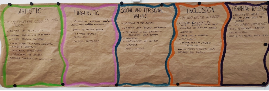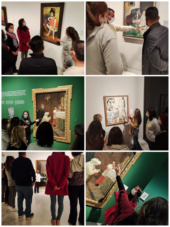 En el Departamento de Educación del Museu Picasso continuamos ampliando nuestra red de trabajo con la comunidad educativa: con el barrio (Proyectos de Barrio); con la ciudad (Proyecto Tándem); a escala de Cataluña (programa de becas y formaciones del cuerpo docente y claustros de escuelas); para todos (Cápsulas Digitales en línea), y ahora, un paso más, para Europa, en un proyecto Erasmus+, el programa de la UE para dar apoyo a la educación, a la juventud y al deporte en Europa. A lo largo de este curso 2021-22, hemos iniciado nuestra participación como formadoras en el proyecto de Erasmus+ «Arte para la Educación Inclusiva», liderado por el Instituto La Guineueta de Barcelona y que está integrado por escuelas e institutos de Turquía, Rumanía, Italia y de nuestro país que tienen un denominador común: se encuentran situados en zonas y regiones con un índice socioeconómico bajo y tienen un porcentaje elevado de alumnos que no prosiguen su trayectoria educativa hacia una formación superior. Mediante la técnica de arteterapia y de las Estrategias de Pensamiento Visual (Visual Thinking Strategies en inglés, y en adelante VTS), «Arte para la Educación Inclusiva», tiene como objetivo conseguir una mayor inclusión y cohesión grupal del alumnado y motivar un porcentaje mucho más elevado de estudiantes para que continúen los estudios superiores. Asimismo, se quiere incorporar el uso de actividades artísticas en la mayoría de las materias escolares para lograr un aprendizaje competencial basado en los intereses y la implicación del alumnado en su proceso de aprendizaje.