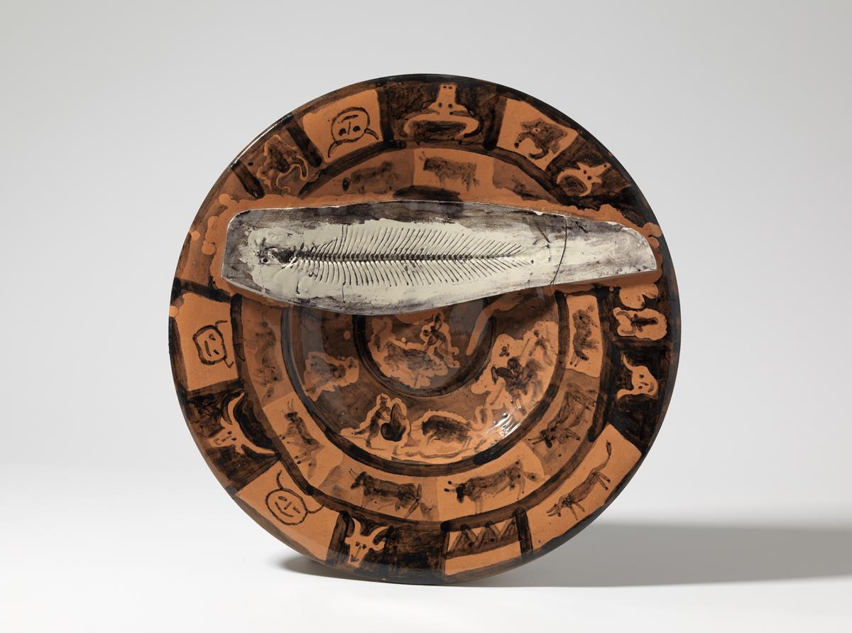 Barro rojo cocido, torneado, con un pez superpuesto (barro blanco cocido, impreso con la raspa de un pez, vidriado, pátina gris; agrietado y reparado), decorado con pátina y óxido negro, parcialmente pintado con barniz. Reverso: pintado con barniz, decorado con incisiones, pátina negra