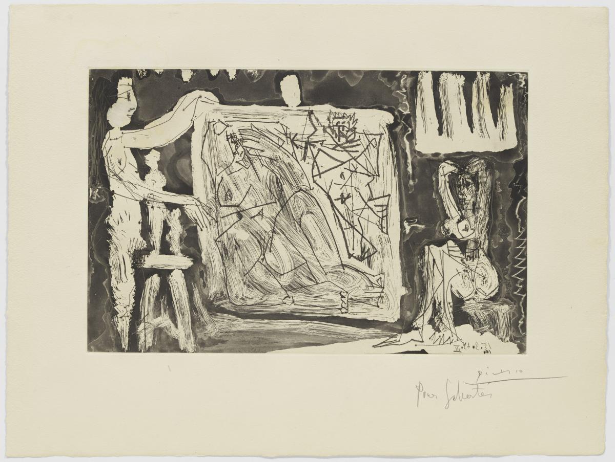 Aguatinta (reservas al barniz líquido y al lápiz litográfico, mordida a mano en el graneado) y aguafuerte sobre cobre; estampado sobre papel vitela Richard de bas (prueba Sabartés)