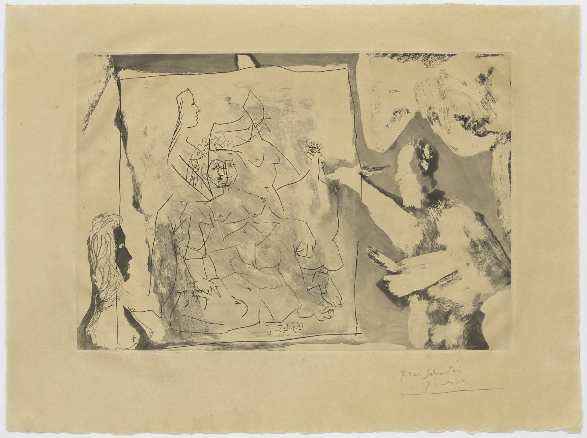 Aguatinta (reservas al barniz y mordida a mano en el graneado) aguafuerte y punta seca sobre cobre; estampado sobre papel vitela Auvergne Richard de Bas (prueba Sabartés)