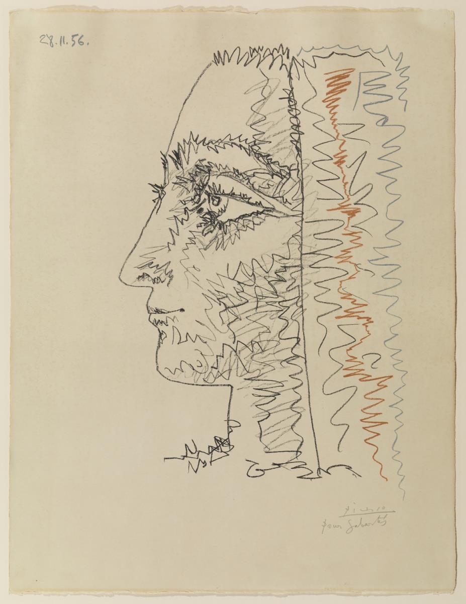 Litografía en tres colores. Lápiz litográfico sobre papel reporte transferido sobre piedra; estampado sobre papel vitela Arches (prueba Sabartés)